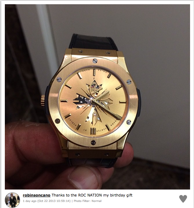 The first jock to sign with Roc Nation Sports got an expensive birthday gift from Jay Z. Yankees Robinson Cano was gifted a limited edition “Shawn Carter by Hublot.” There were only 100 pieces created in 18k gold. The price tag on that, $33,900.