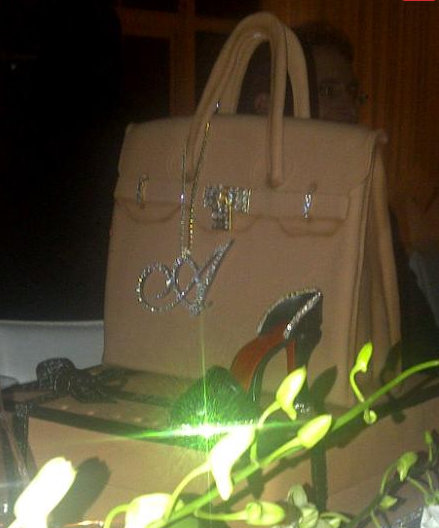 The cake was a Hermes bag cake topped with Louboutin heels and adorned with a crystal “A”. LOVE it! Check out more photos: