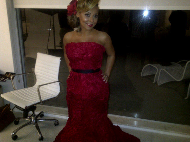 Adrienne is wearing a Red Salsa layered ruffle gown by Rafael Cennamo.