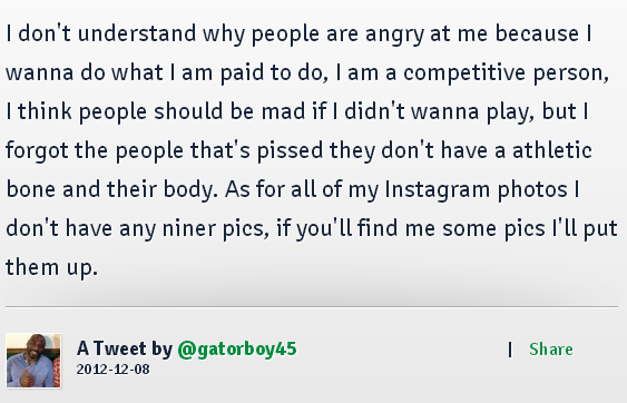 ”I don’t understand why people are angry at me because I wanna do what I am paid to do, I am a competitive person, I think people should be mad if I didn’t wanna play. … As for all of my Instagram photos I don’t have any niner pics, if you’ll find me some pics I’ll put them up.”
