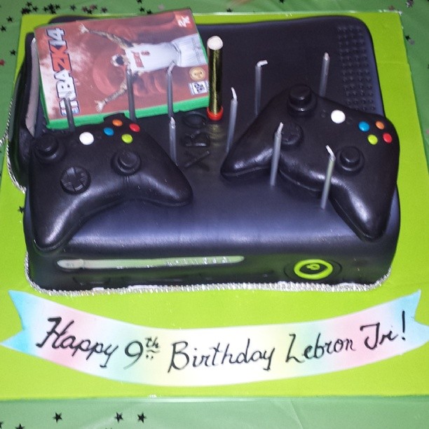 LeBron James’ oldest son, LeBron James Jr. or Bronny, turned 9 over the weekend and his parents thre him a surprise party that included a cake shaped like an X-Box, a video game truck and custom sno cones. Of course Lebron’s cover for NBA 2K14 was the game featured.