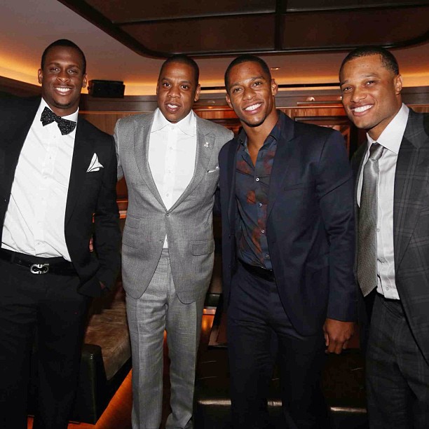 Jay Z and his Roc Nation Sports might have agents a little shook but that didn’t stop the jocks from coming out to celebrate the 10th anniversary of Jay’s 40/40 club in New York. Roc Nation Sports clients Robinson Cano, Victor Cruz and Geno Smith were on hand along with Yankees CC Sabthia, Patriots owner Robert Kraft, singer Maxwell, Adrienne Baillon, TI & Tiny, Amaré Stoudemire and of course Beyoncé.