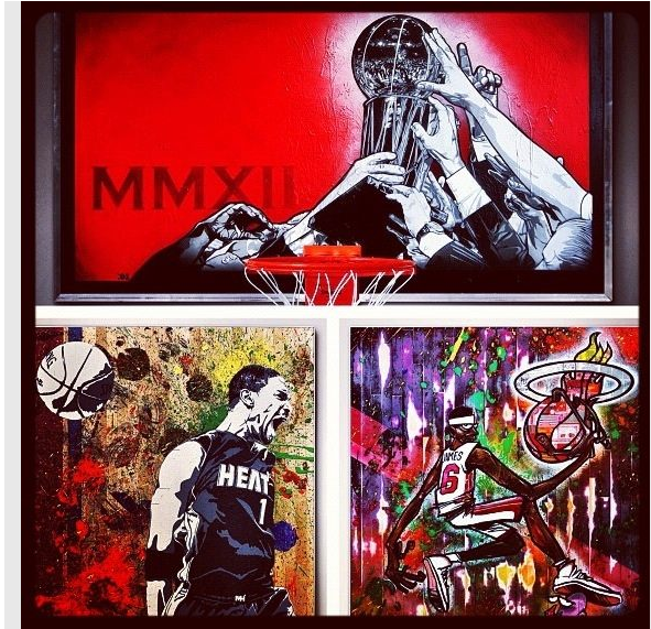 If you happened to be in Miami this week, you know Art Basel has taken over. Friday night Dwyane Wade and Chris Bosh hosted an event showcasing a graffiti and street artist exhibition, “Art of Basketball – Heat Wave,” curated by Billi Kid featuring works inspired by the Heat and their NBA championship.