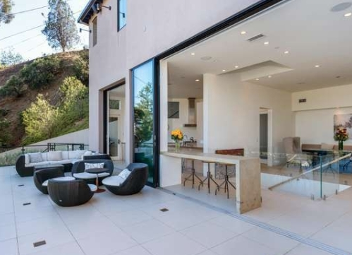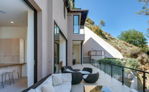 The modern home also boasts a living room that opens on to a patio which has mountain and city views.