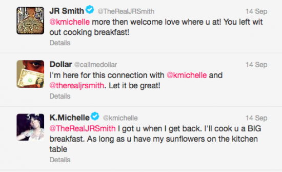 Knicks player JR Smith is not shy about expressing his interest or budding love affair via Twitter. Looks like JR has set his sights on “Love & Hip-hop Atlanta’s” K Michelle. The two have been flirting via the social networking platform. With K Michelle even serenading the baller on his birthday.