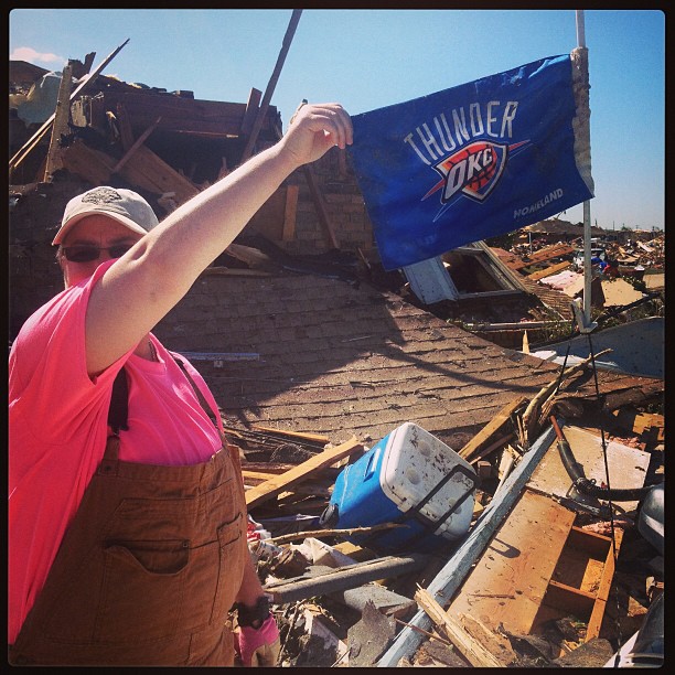 Moore, Oklahoma was hit by a tornado earlier this week that devastated that community. The Oklahoma City Thunder immediately jumped into action lending a helping hand. Kevin Durant opened his wallet to donate $1 million and the Thunder organization and the NBA followed suit. KD also reached out to his shoe company, Nike and they are donating $1 million worth of product to the victims. Durant, Russell Westbrook along with other teammates and Thunder personnel toured Moore on Wednesday afternoon, surveying the destruction, meeting with residents, offering an autograph here, a picture there, a few moments of conversation offering comfort and whatever else they could provide to the community.