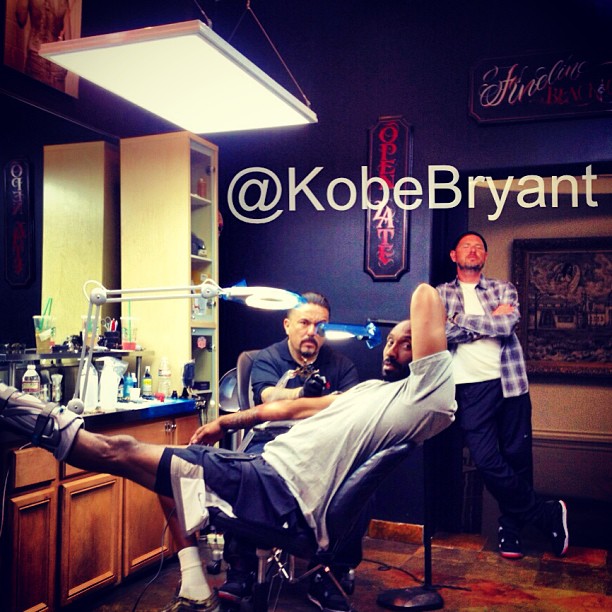 Kobe Bryant mentioned on Twitter that he wanted to get a new tattoo. One thought he had was a rosary coming down his arm. He’s working with the world famous tattoo artist Mr. Cartoon. Kobe hopped on Instagram to show part of the progress, so far it’s his right forearm with his daughters names. He said he’s getting more done which I HOPE – yes, I’m going to continue to state it for the record – includes something better to that Vanessa tatt with the crown and wings he got.