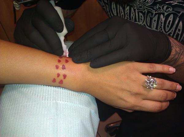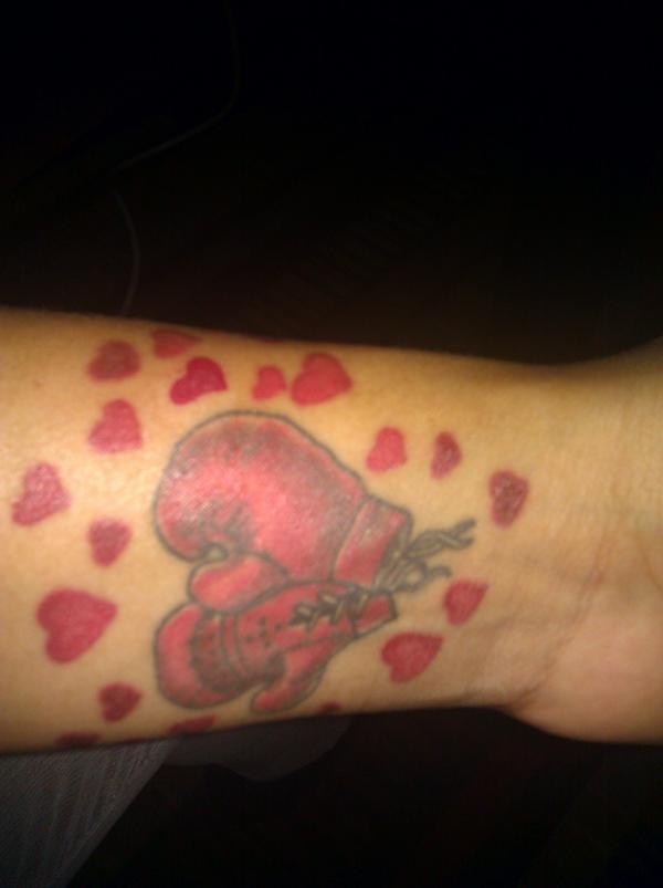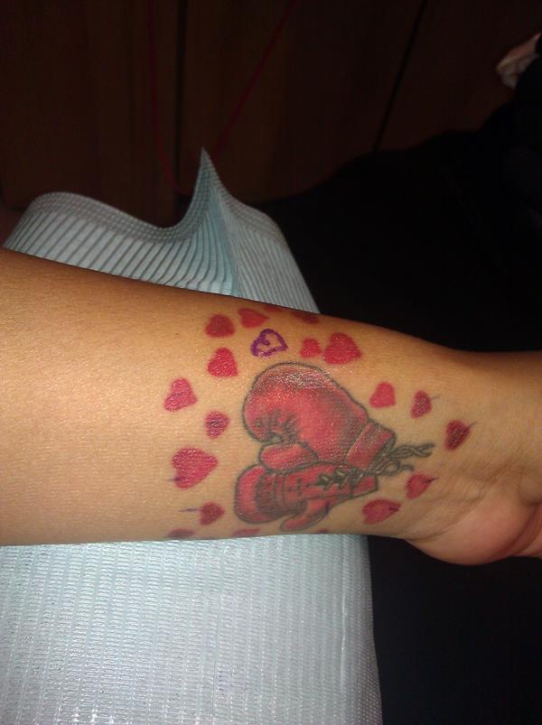 Jackson is so proud of her fiance, Floyd Mayweather’s boxing record that she got a heart tattooed on her wrist for every victory. 42 hearts plus the gloves, “Team Money” goes hard I guess.