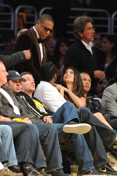 Last night the Lakers took on the up and coming OKC Thunder (and like the snipers they are, knocked them off with precision but I digress). Right across the street from Staples Center at the Nokia theater @ LA Live, the American Music Awards were taking place. Look who popped over right after his performance in full out ’09 Sinatra swag, Jay Z. I LOVE IT!!