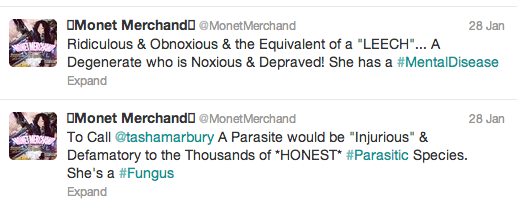 A quick sweep of Merchand’s Twitter page reveals a few tweets where she refers to Tasha as a “fungus,” “Ridiculous & Obnoxious & the Equivalent of a “LEECH”… A Degenerate who is Noxious & Depraved! She has a #MentalDisease ”