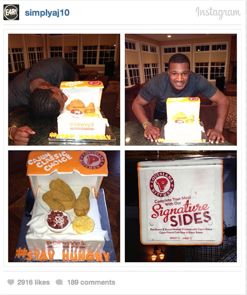 We’ve seen cakes shaped like Louboutins, Louis Vuitton bags, laptops and Hennessy bottles. But, I’ve never seen a cake to resemble a Popeye’s chicken box, delectable side dishes included. Apparently Baltimore Orioles center fielder, Adam Jones has a love for the fast food establishment so a friend thought it would be a great idea to get him a birthday cake in the image of a three-piece combo.