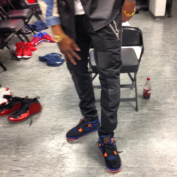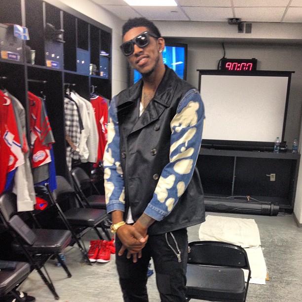 Clippers Nick Young is singly handedly trying to revise the fashion face of the Clippers. We’ve already spotted Young in Versace. But here he kicks it up a notch (or 10) in a leather vest, white cloud embroider denim shirt, skinny pants and some J’s.