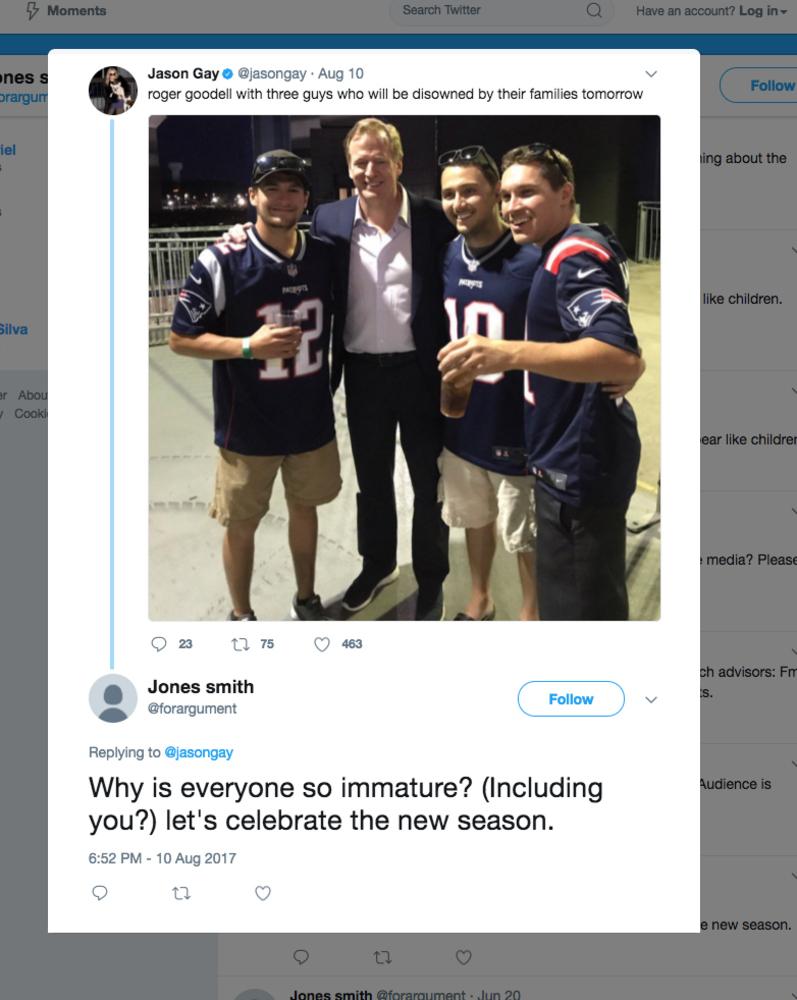 @ForArgument AKA “Jones Smith” had no followers, no profile photo and very rarely tweeted. But, when it did, the replies would be to articles and posts that were critical of the NFL commissioner.